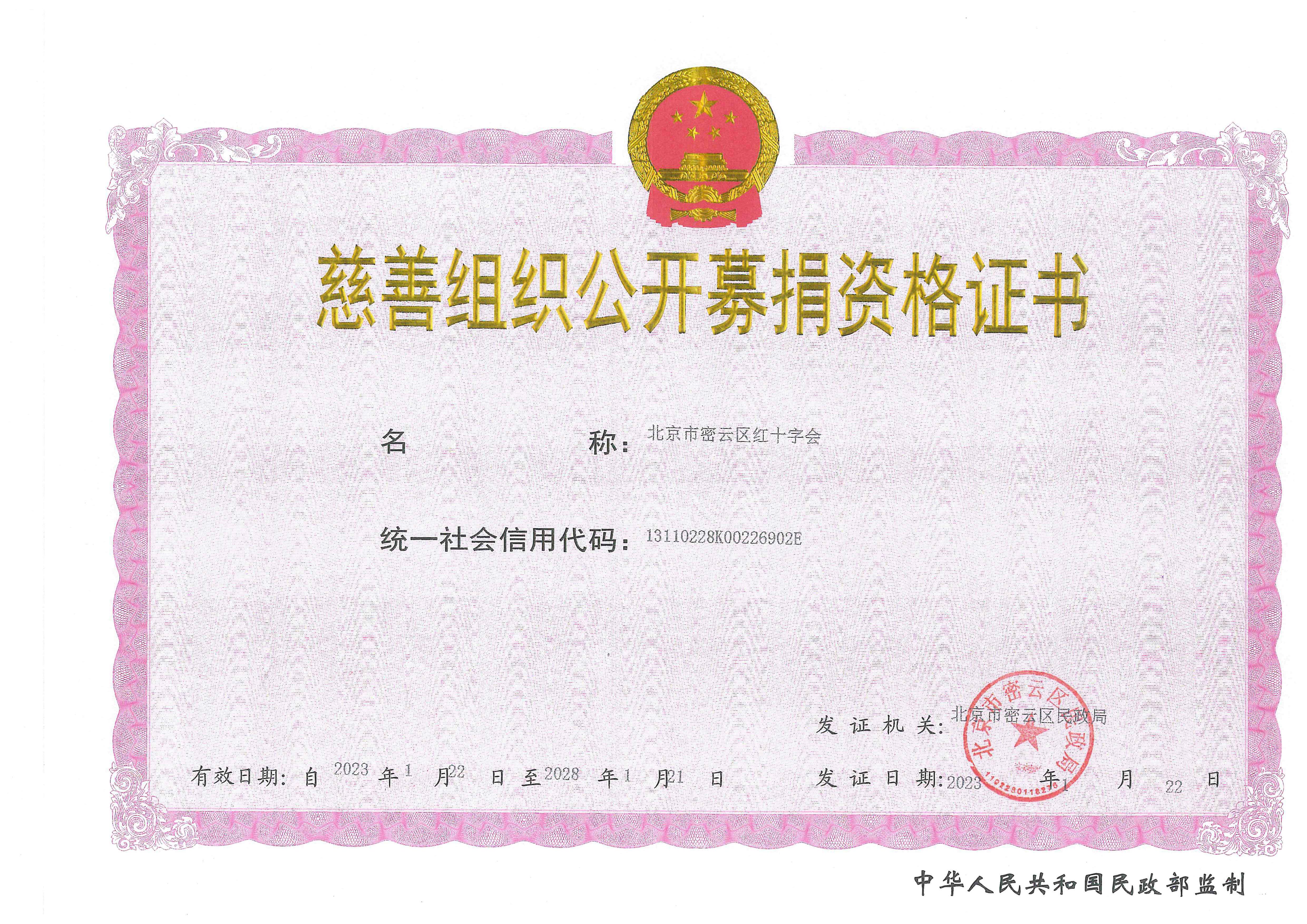 (一)北京市密云区红十字会统一社会信用代码为13110228K00226902E。关于我会公益性捐赠税前扣除资格的公告请点击以下链接:《北京市财政局 国家税务总局北京市税务局关于公布北京市2024年度-2026年度获得公益性捐赠税前扣除资格的公益性群众团体名单的公告》